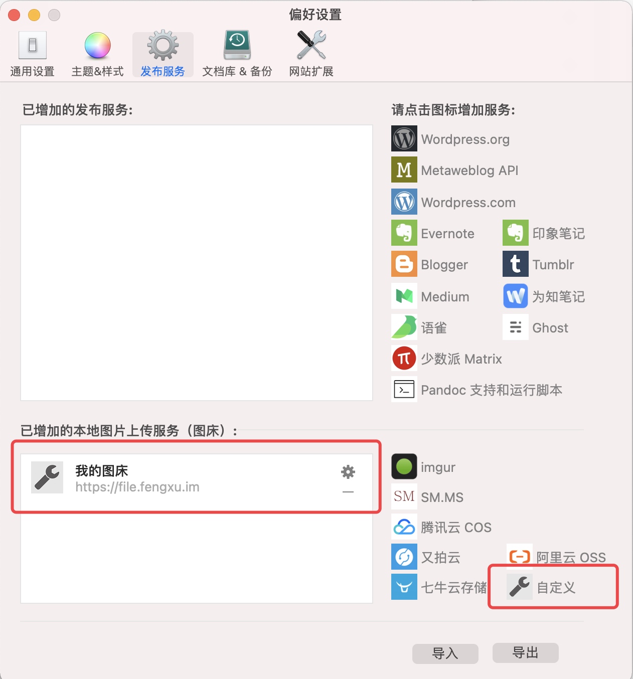 依次进入首选项 - 发布服务 - 图床 - 自定义,按你的服务域名填写对应项: