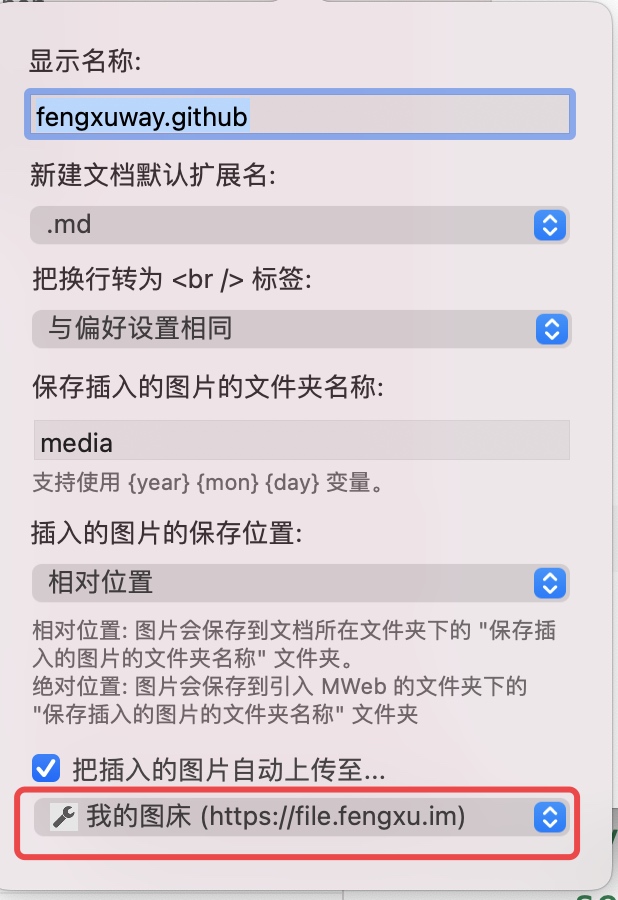 直到今天无意间发现自己用的 MWeb 笔记软件有自定义图床,索性写个服务尝试了一下,整个过程很简单,如果大家对安全性/隐私性要求高,且用的 markdown 编辑软件提供如图“自定义图床”这样的功能,不妨一试~